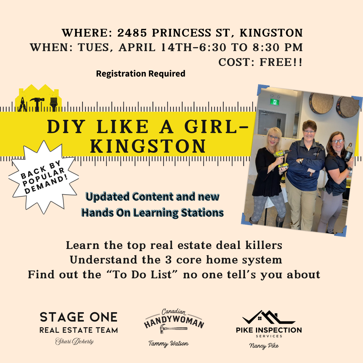 Back by popular demand! Join Nancy Pike, Tammy Watson, and Shari Doherty for a free, hands-on DIY Like a Girl workshop in Picton. Learn practical home skills, gain confidence, and have fun.